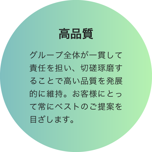 グループ全体が一貫して責任を担い、切磋琢磨することで高い品質を発展的に維持。お客様にとって常にベストのご提案を目ざします。